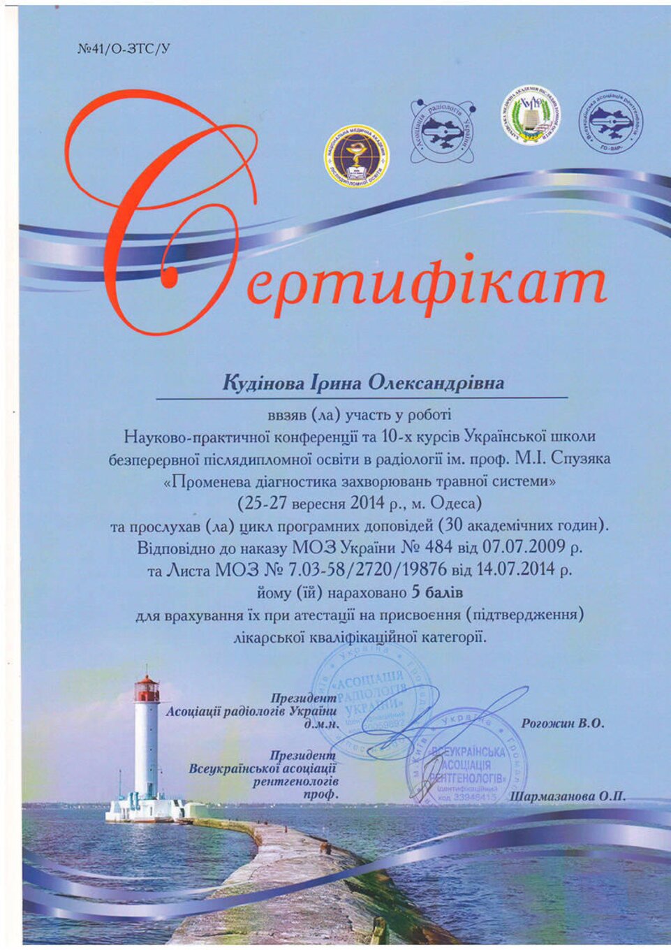 – закінчила 10-ті курси Української школи безперервної післядипломної освіти в радіології ім. проф. М. І. Спузяка на тему «Променева діагностика захворювань травної системи», м. Одеса.