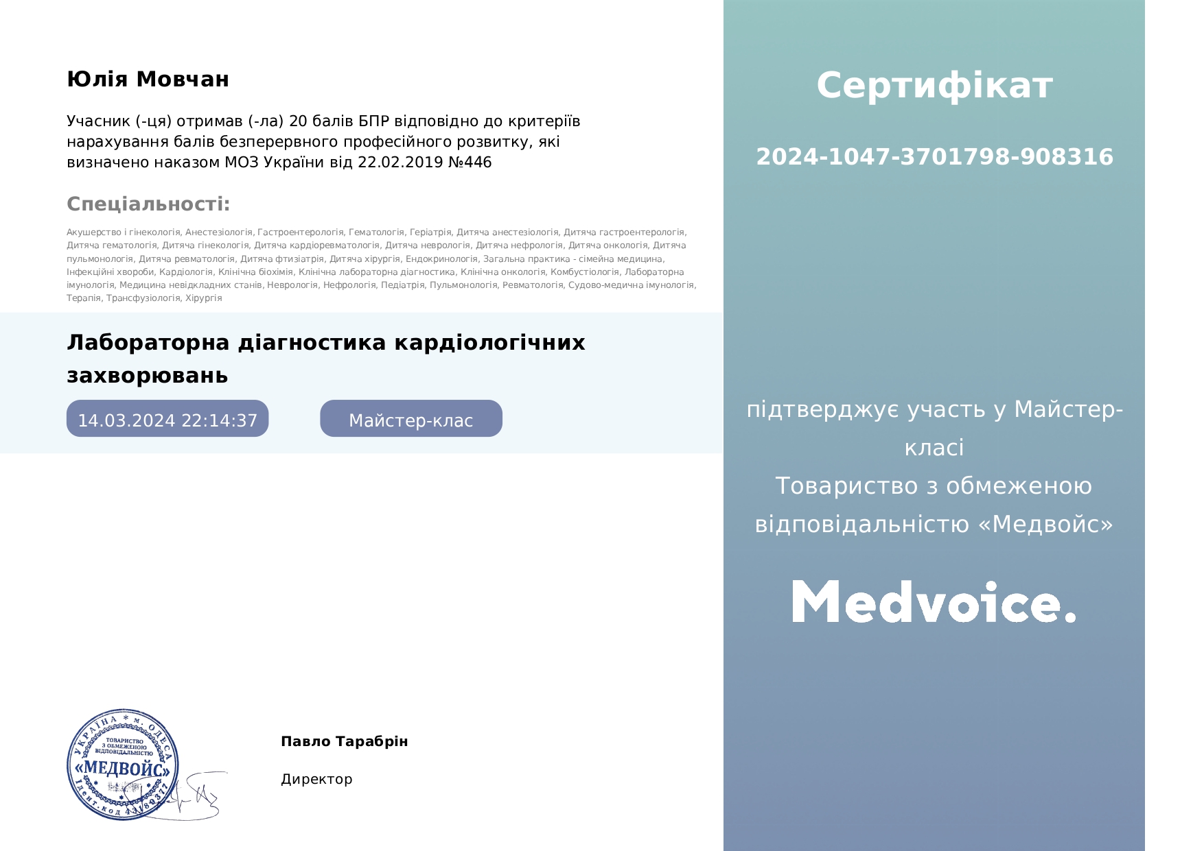 2025 р. – спеціалізація “Нефрологія”, НУОЗУ ім. П. Л. Шупика;